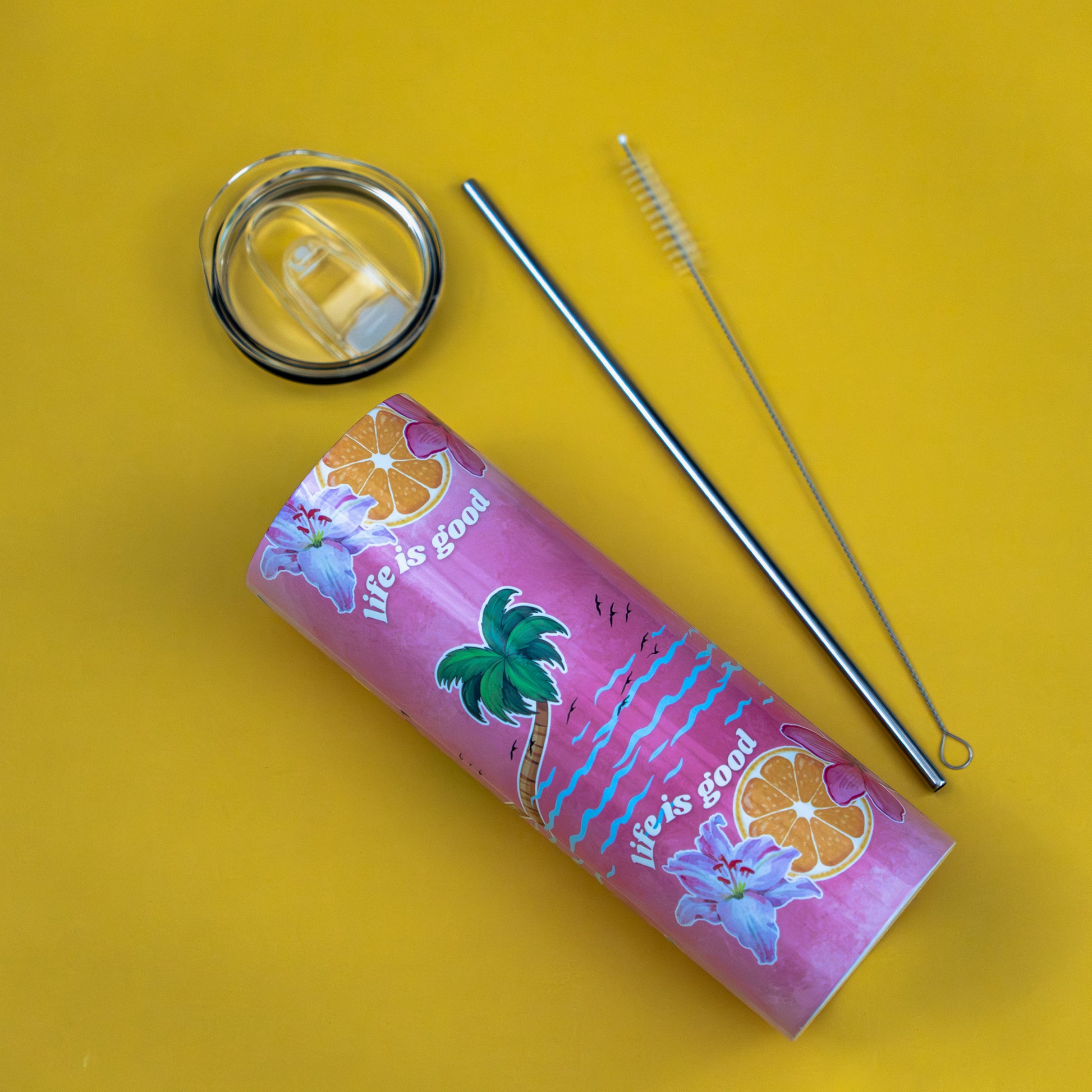 I’m covered in color and a reminder worth keeping: “Life Is Good.” Toss me in your tote bag, hold me at work — I’m the tumbler that spreads sunshine daily!