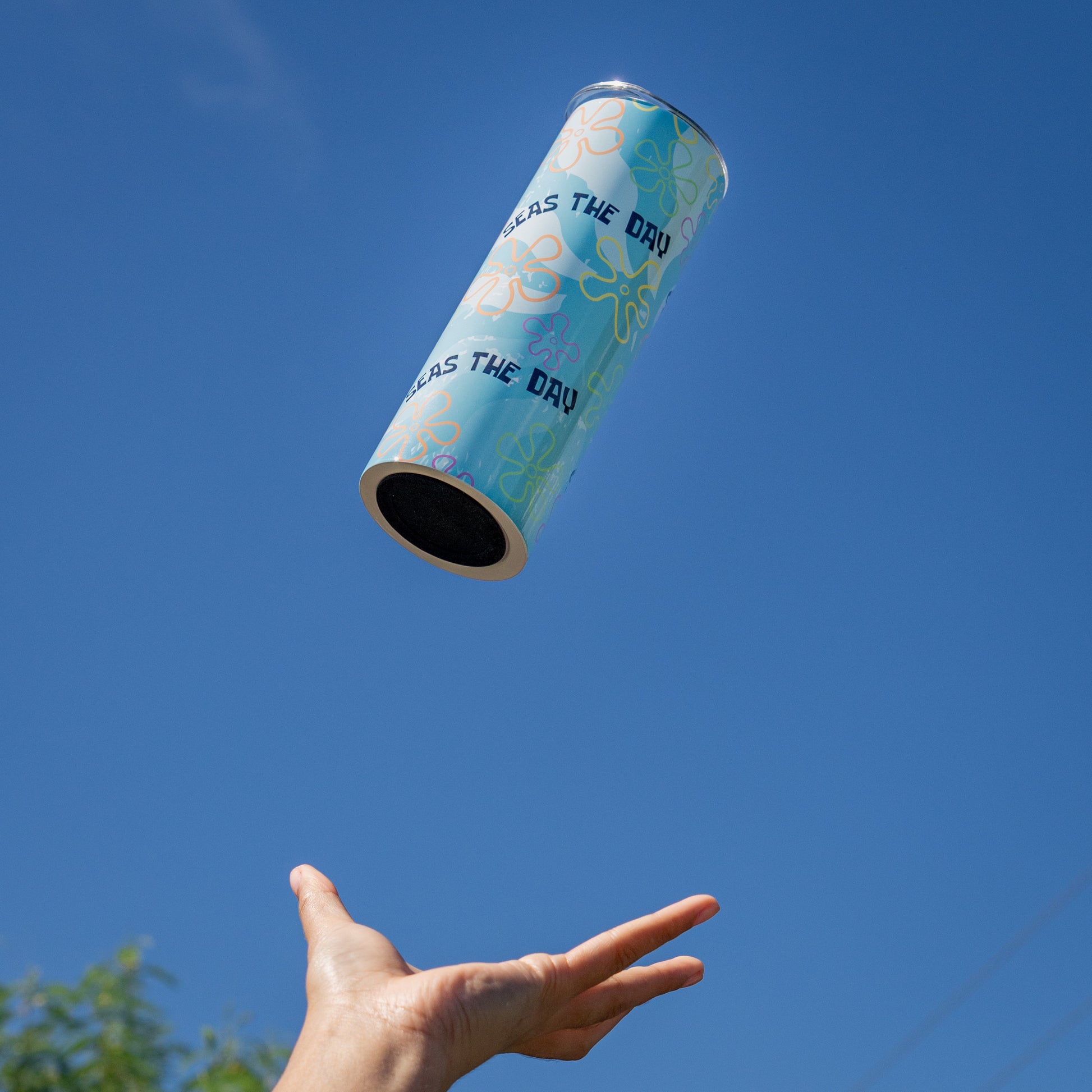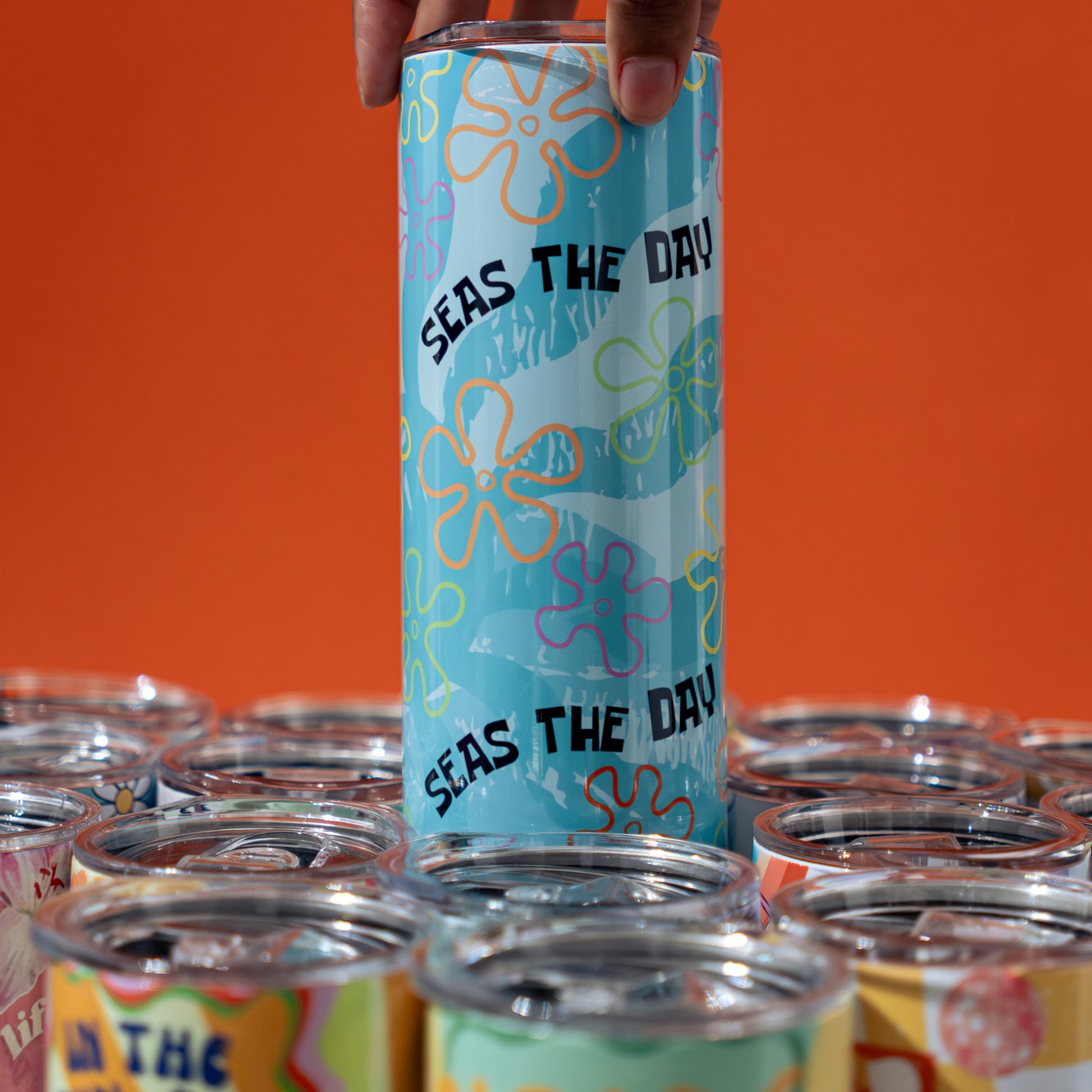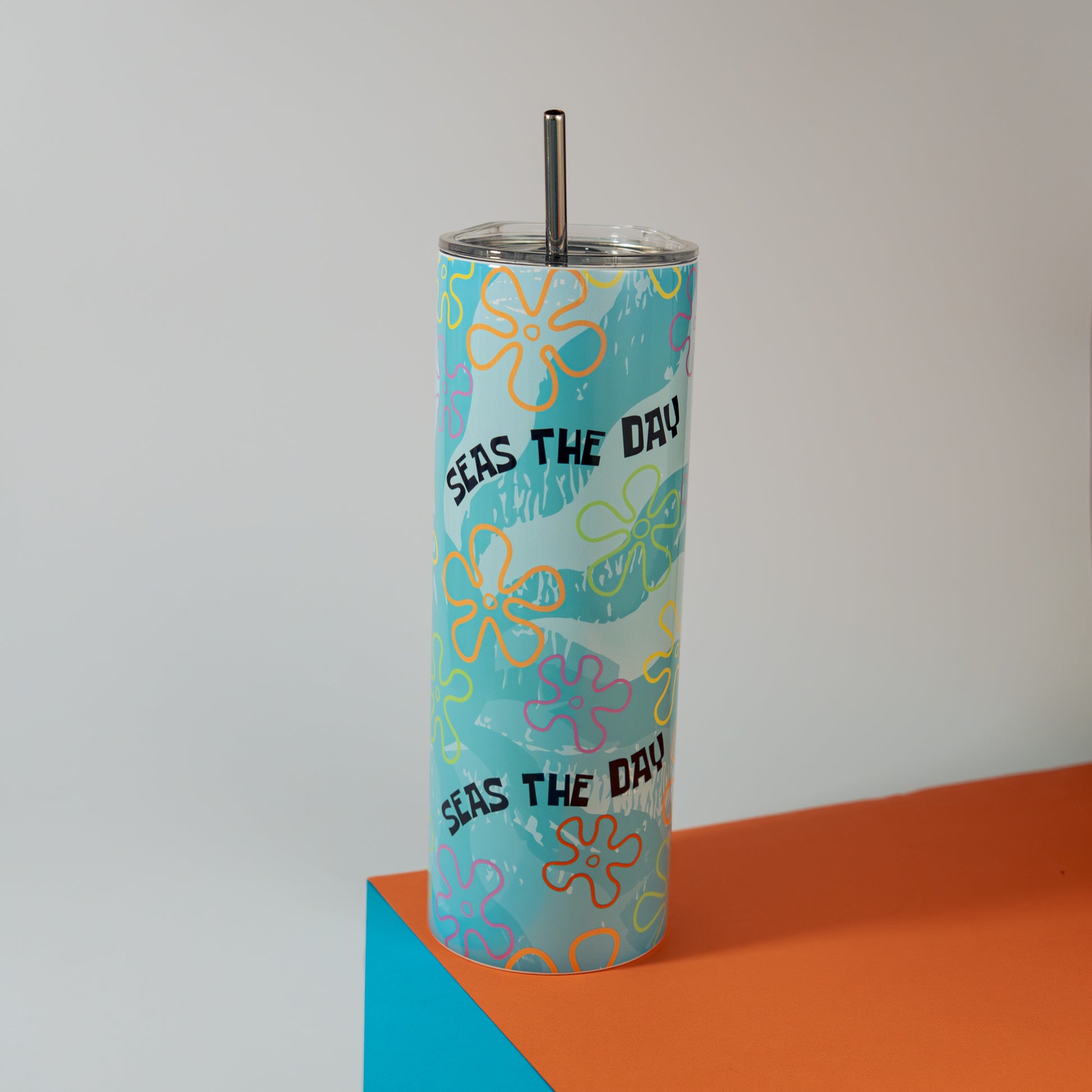 Retro flowers, ocean waves, and a cheeky grin — I’m basically what SpongeBob would sip from if he traded his pineapple for a tumbler!
